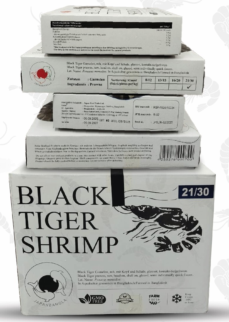 Unsere Black Tiger Riesengarnelen stammen aus nachhaltiger Aquakultur in Bangladesch und Indien. Die Zucht erfolgt in sorgfältig ausgewählten Betrieben, die nach biologischen Standards arbeiten und großen Wert auf Umweltverträglichkeit sowie artgerechte Haltung legen.